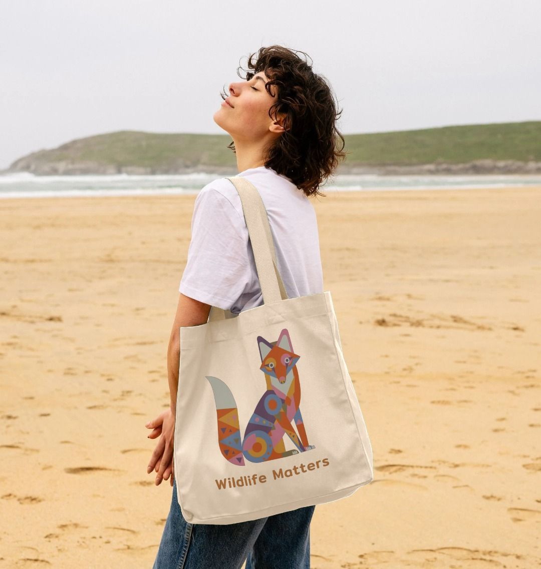 Wildlife Matters Cosmo Fox tote bag has a classic style and is made from organic cotton with a premium look and feel. These lightweight tote bags are perfect for gym, work, and everyday shopping. They are surprisingly durable and can be folded up small enough to fit in your pocket. Available in Black or Natural