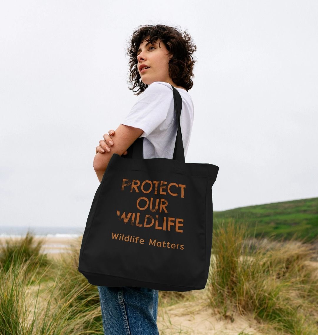 Wildlife Matters Protect our Wildlife tote bag has a classic style and is made from organic cotton with a premium look and feel. These lightweight tote bags are perfect for gym, work, and everyday shopping. They are surprisingly durable and can be folded up small enough to fit in your pocket. Available in Black or Natural